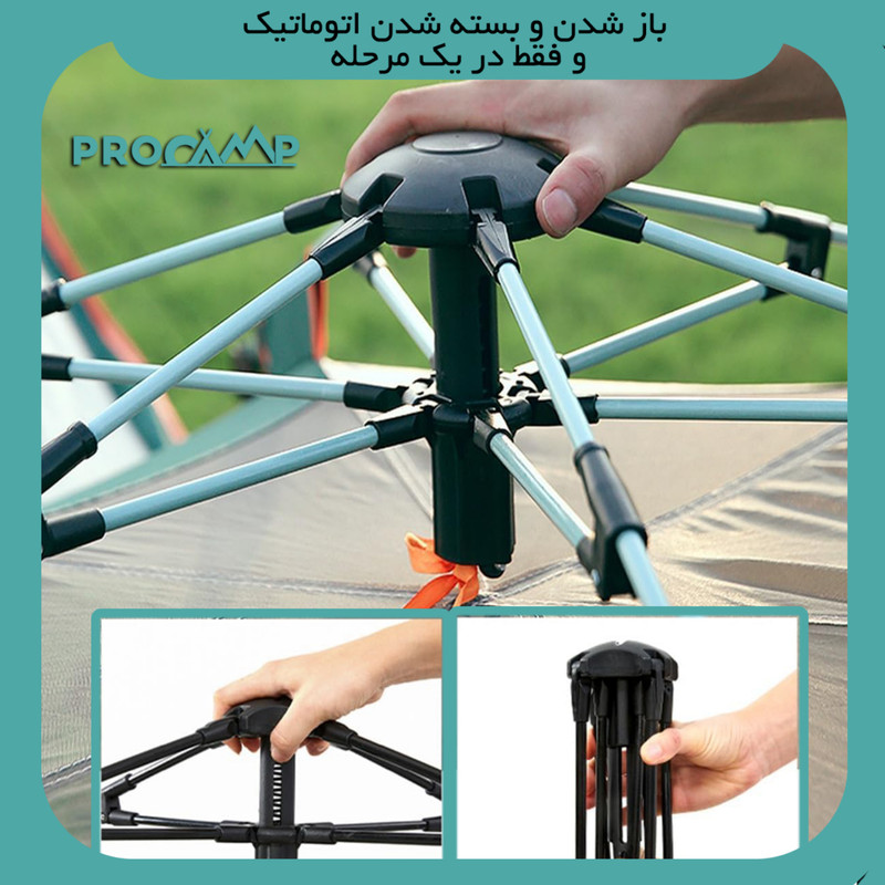 چادر اتوماتیک کمپینگ پروکمپ(procamp) مدل JH-8206-5 ، ماجراجویی های کمپینگ را راحت تر و دلپذیر تر می کند. این محصول تغییر دهنده شیوه برپایی چادر کمپینگ در سهولت و کارایی است. این چادر که هم برای کمپینگهای باتجربه و هم برای تازه واردان طراحی شده است، راحتی، دوام و راحتی بینظیری را برای تمام گردشهای شما در فضای باز ارائه میدهد. این محصول که به شکل یک شش ضلعی طراحی شده به دلیل ویژگی تنظیم خودکار خود که به چادر اتوماتیک معروف شده مزیت خوبی دارد که به شما امکان می دهد در چند ثانیه چادر خود را برپا کرده و یا جمع کنید. چادر با طراحی پاپ آپ(pop up) مبتکرانه خود، تقریباً فوراً به شکل چادر در می آید و زحمت مونتاژ چادرهای سنتی را از بین می برد. فضای سخاوتمندانه ای در این مدل چادر سفری برای جای دادن راحت تر افراد ارائه می شود. طراحی خوب آن شامل فضای سر زیاد و فضای داخلی جادار است که تجربه ای راحت را حتی در سفرهای طولانی تضمین می کند. این چادر دارای دو پنجره مشبک بزرگ و منافذ تهویه برای افزایش جریان هوا است ، دو در نیز که هر دو دارای سایبان هستند نیز در دو طرف دیگر تعبیه شده و فضای داخلی را حتی در شب های گرم، خنک و تازه نگه می داردو از این رو برای سه فصل مناسب است. لازم بذکر است که همه در ها و پنجره ها دارای توری پشه بند با زیپ جدا و محل جمع شدن جدا از روکش در و پنجره هستند. چادر کمپینگ پرو کمپ مدل JH-8206-5 با مواد با کیفیت، برای مقاومت در برابر عناصر طبیعی ساخته شده است. این چادر دارای یک پوشش مقاوم و ضد آب با پارچه 210D آکسفورد است و همچنین یک کف بادوام و مقاوم در برابر آب که محافظت قابل اعتمادی در برابر باران، باد و رطوبت دارد.استاندارد ضد آب آن PU2000mm گزارش شده است. میله های قوی و مستحکم و درزهای تقویت شده در مقابل نفوذ آب به دوام کلی آن کمک می کند و اطمینان حاصل می کند که چادر در شرایط مختلف آب و هوایی عملکرد خوبی دارد. ابعاد این چادر ۱۵۸×۲۸۰×۲۸۰ سانتی متر بوده که در دو طرف آن سایبان با ابعاد ۱۳۰×۱۴۰ سانتی متر هم برپا می شود که کارایی آن را دوچندان می کند. چادر کمپینگ اتوماتیک پروکمپ مدل JH-8206-5 با راه اندازی سریع و آسان، طراحی جادار و محافظت قابل اعتماد در برابر آب و باد، تجربه ای بدون دردسر و لذت بخش در فضای باز را تضمین می کند.